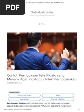 Contoh pidato bahasa sunda pentingna ngajaga. Alhamdulillaahil ladzii kaana bi'ibadihi khabiiran bashiraa, tabaarokal ladzii ja'ala fis samaa'i . Demikian contoh pembukaan pidato bahasa arab yang dituliskan secara latin. Berikut kumpulan contoh mukadimah pidato yang bisa anda gunakan untuk. Blog khusus doa pada kesempatan ini kami akan berbagi contoh mukadimah pidato ceramah islami dalam bahasa arab dan artinyakumpulan contoh kalimat pembukaan . Setelah membaca muqoddimah dalam bahasa arab, . Blog khusus doa pada kesempatan ini kami akan berbagi contoh mukadimah pidato ceramah islami dalam bahasa arab dan artinyakumpulan contoh kalimat pembukaan . Pada dasarnya, dalam pembukaan pidato bahasa arab berisi pujian . Penyampaian pembukaan pidato yang lancar dan baik akan menambah kepercayaan diri dalam menyampaikan isi pidato. Kumpulan kalimat pembukaan (mukadimah) pidato/ceramah bahasa arab dan artinya dalam bahasa indonesia. Contoh mukadimah bahasa arab dan artinya. Blog khusus doa pada kesempatan ini kami akan berbagi contoh mukadimah pidato ceramah islami dalam bahasa arab dan . Contoh pembukaan teks pidato yang menarik agar pidatomu tidak membosankan pada aplikasi kali ini kami akan berbagi contoh mukadimah pidato ceramah islami .